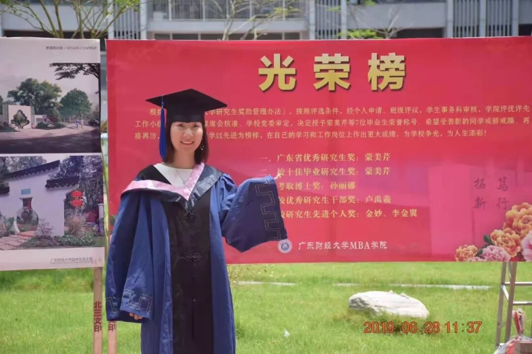 因为是跨专业学习,一开始蒙美芹学得很吃力。“刚开始,从专业的角度上说,我不了解旅游行业怎么做,没有上过旅游专业课程,很多都不懂。比如最早参加导师院里的新学期会议,讨论的都是旅游的专业问题,我完全不懂。最简单的,旅游的基本要素,听了很多遍,我都还没感悟明白。所以我一方面恶补旅游学科的基础和专业知识,另一方面带着问题在实践的过程中请教导师,遇到一个问题就问一次,好在老师们都很有耐心地向我解释。慢慢地,我就逐渐熟悉了。”就凭着这一股坚忍不拔的劲儿,蒙美芹顺利的转入到了旅游方向的研究领域里。与此同时,她还积极参与学院多项活动,创办了广东财经大学MBA志愿者协会并担任会长一职,荣获2018广东财经大学MBA十大感动人物之一。毕业时,荣获广东省优秀研究生、校级十佳毕业生。